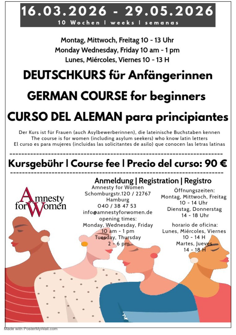 Der von Amnesty for Women e.V. angebotene Deutschkurs hat die Zielsetzung, Migrantinnen bei ihrer Integration in Hamburg zu unterstützen und auf den Integrationskurs vorzubereiten.